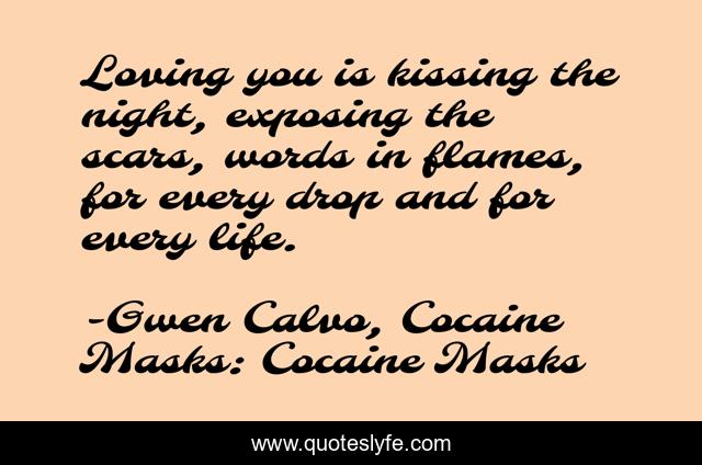 This page presents the quote "Loving you is kissing the night, exposing the scars, words in flames, for every drop and for every life.". Author of this quote is Gwen Calvo, Cocaine Masks: Cocaine Masks. .