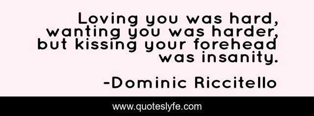 This page presents the quote "Loving you was hard, wanting you was harder, but kissing your forehead was insanity.". Author of this quote is Dominic Riccitello. This quote is about forehead, crazy, love, relationship, quote, hard, emotions, insanity, lust,.