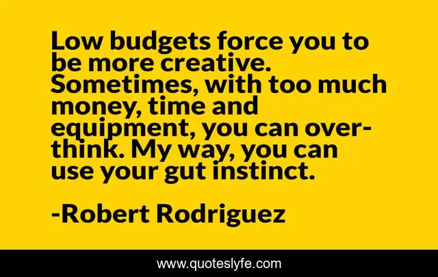 This page presents the quote "Low budgets force you to be more creative. Sometimes, with too much money, time and equipment, you can over-think. My way, you can use your gut instinct.". Author of this quote is Robert Rodriguez. This quote is about time, creative,.