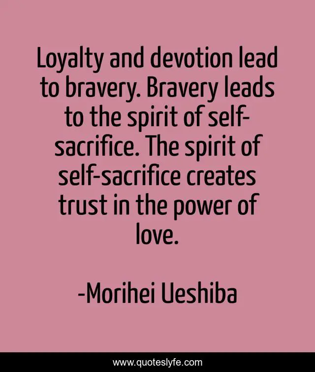 This page presents the quote "Loyalty and devotion lead to bravery. Bravery leads to the spirit of self-sacrifice. The spirit of self-sacrifice creates trust in the power of love.". Author of this quote is Morihei Ueshiba. This quote is about trust, love-story, power,.