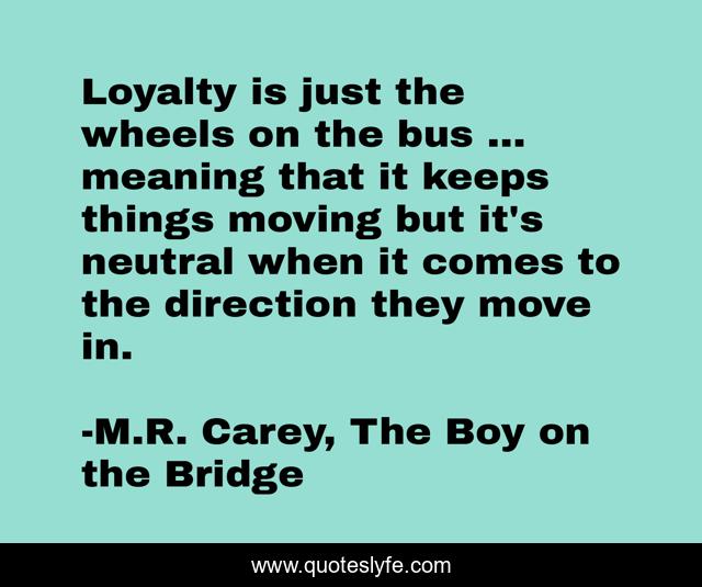This page presents the quote "Loyalty is just the wheels on the bus ... meaning that it keeps things moving but it's neutral when it comes to the direction they move in.". Author of this quote is M.R. Carey, The Boy on the Bridge. .
