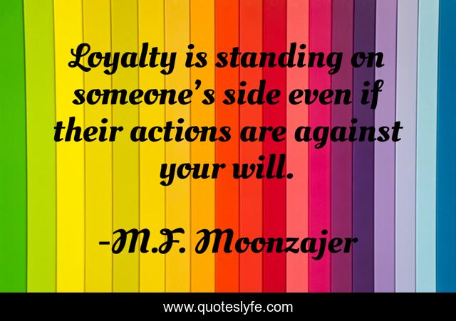 This page presents the quote "Loyalty is standing on someone’s side even if their actions are against your will.". Author of this quote is M.F. Moonzajer. This quote is about actions, against, loyalty,.