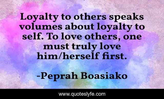 This page presents the quote "Loyalty to others speaks volumes about loyalty to self. To love others, one must truly love him/herself first.". Author of this quote is Peprah Boasiako. This quote is about life, love, self, self-love, loyalty, self-realization, loyal, self-improvement, life-lessons,.