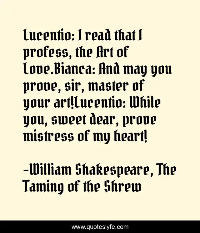 Lucentio: I read that I profess, the Art of Love.Bianca: And may you prove, sir, master of your art!Lucentio: While you, sweet dear, prove mistress of my heart!