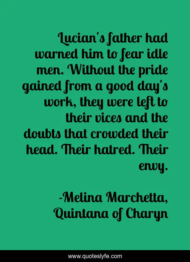 This page presents the quote "Lucian's father had warned him to fear idle men. Without the pride gained from a good day's work, they were left to their vices and the doubts that crowded their head. Their hatred. Their envy.". Author of this quote is Melina Marchetta, Quintana of Charyn. This quote is about idle-men, envy, work, hatred,.