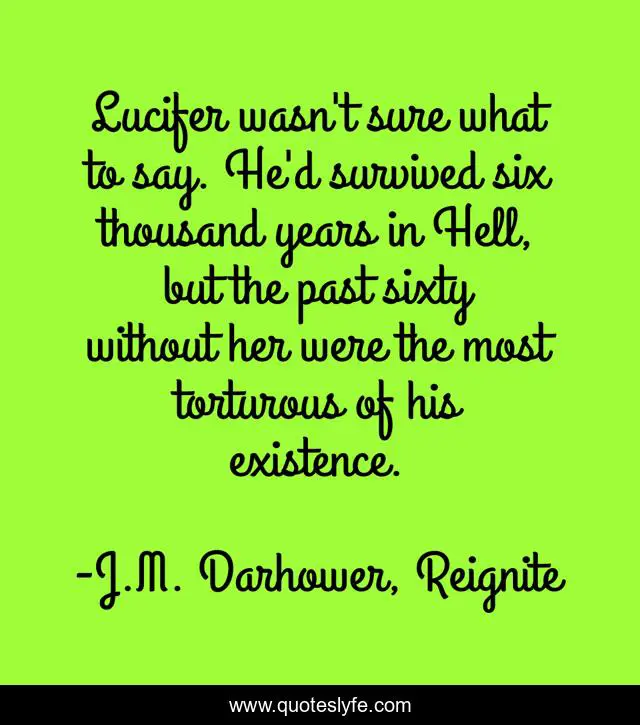 This page presents the quote "Lucifer wasn't sure what to say. He'd survived six thousand years in Hell, but the past sixty without her were the most torturous of his existence.". Author of this quote is J.M. Darhower, Reignite. This quote is about life, death, love, lucifer, serah, hell, affection,.