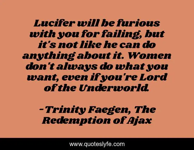 This page presents the quote "Lucifer will be furious with you for failing, but it's not like he can do anything about it. Women don't always do what you want, even if you're Lord of the Underworld.". Author of this quote is Trinity Faegen, The Redemption of Ajax. This quote is about girl-power, strong-willed, humor, women,.
