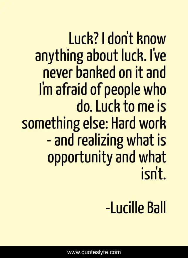 This page presents the quote "Luck? I don't know anything about luck. I've never banked on it and I'm afraid of people who do. Luck to me is something else: Hard work - and realizing what is opportunity and what isn't.". Author of this quote is Lucille Ball. This quote is about hard work, opportunity, luck,.