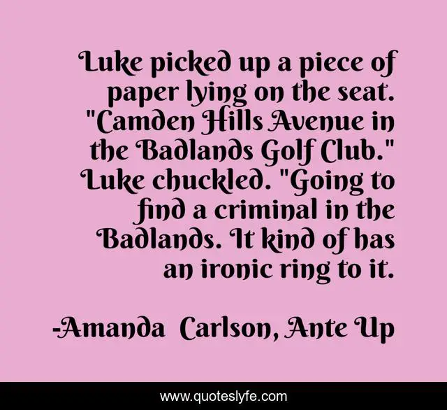 This page presents the quote "Luke picked up a piece of paper lying on the seat. "Camden Hills Avenue in the Badlands Golf Club." Luke chuckled. "Going to find a criminal in the Badlands. It kind of has an ironic ring to it.". Author of this quote is Amanda Carlson, Ante Up. This quote is about werewolves, urban-fantasy-romance, paranormal-romance, witches,.