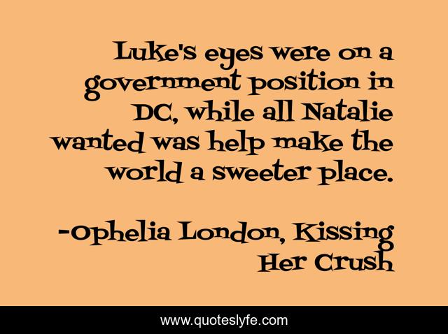This page presents the quote "Luke's eyes were on a government position in DC, while all Natalie wanted was help make the world a sweeter place.". Author of this quote is Ophelia London, Kissing Her Crush. .
