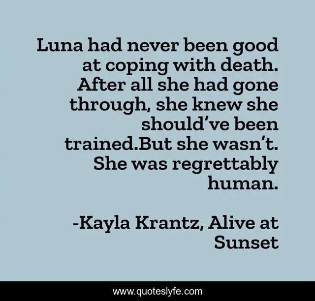 This page presents the quote "Luna had never been good at coping with death. After all she had gone through, she knew she should’ve been trained.But she wasn’t. She was regrettably human.". Author of this quote is Kayla Krantz, Alive at Sunset. This quote is about horror, suspense, intense-emotions, thriller,.