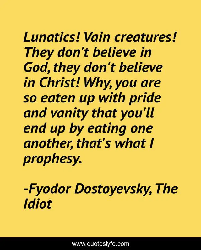 This page presents the quote "Lunatics! Vain creatures! They don't believe in God, they don't believe in Christ! Why, you are so eaten up with pride and vanity that you'll end up by eating one another, that's what I prophesy.". Author of this quote is Fyodor Dostoyevsky, The Idiot. This quote is about athiesm, pride,.