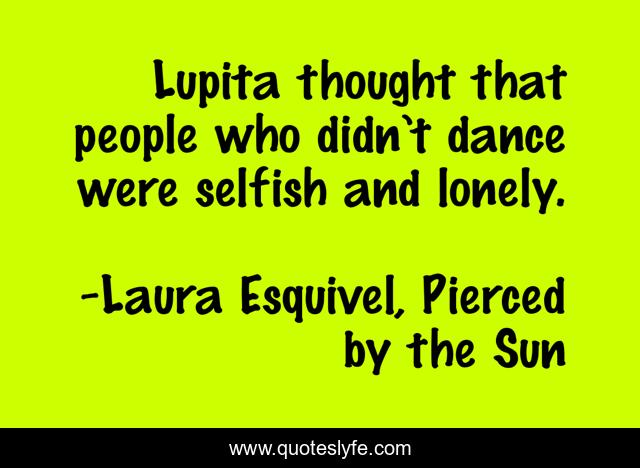 This page presents the quote "Lupita thought that people who didn’t dance were selfish and lonely.". Author of this quote is Laura Esquivel, Pierced by the Sun. This quote is about loneliness, dancing,.
