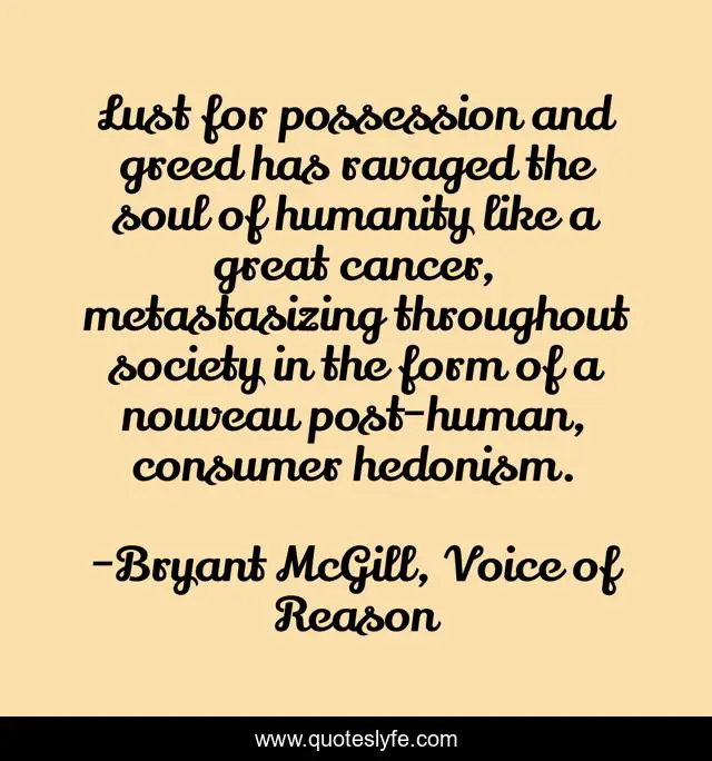 This page presents the quote "Lust for possession and greed has ravaged the soul of humanity like a great cancer, metastasizing throughout society in the form of a nouveau post-human, consumer hedonism.". Author of this quote is Bryant McGill, Voice of Reason. This quote is about desire, possession, social-problems, pleasure, hedonism, greed,.