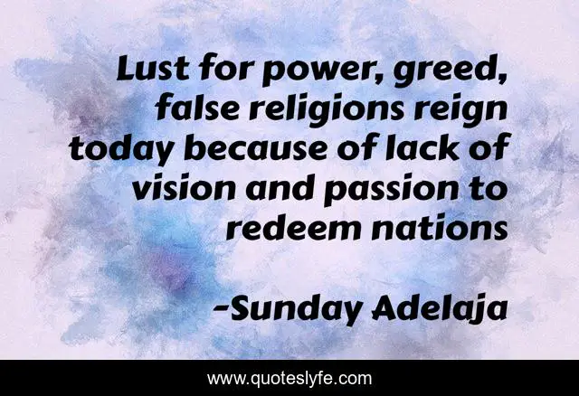 This page presents the quote "Lust for power, greed, false religions reign today because of lack of vision and passion to redeem nations". Author of this quote is Sunday Adelaja. This quote is about greed, power, reign,.
