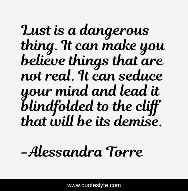 This page presents the quote "Lust is a dangerous thing. It can make you believe things that are not real. It can seduce your mind and lead it blindfolded to the cliff that will be its demise.". Author of this quote is Alessandra Torre. This quote is about lust, seduction, love, affection, danger,.