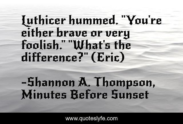 This page presents the quote "Luthicer hummed. "You're either brave or very foolish." "What's the difference?" (Eric)". Author of this quote is Shannon A. Thompson, Minutes Before Sunset. This quote is about fool, dialogue, brave, foolishness, young-adult, paranormal-romance, bravery,.