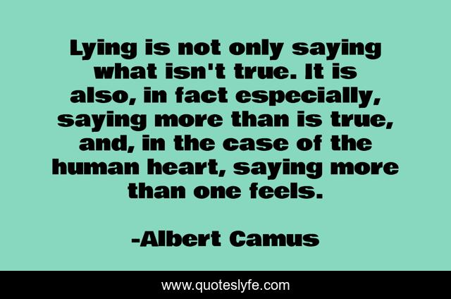 This page presents the quote "Lying is not only saying what isn't true. It is also, in fact especially, saying more than is true, and, in the case of the human heart, saying more than one feels.". Author of this quote is Albert Camus. .
