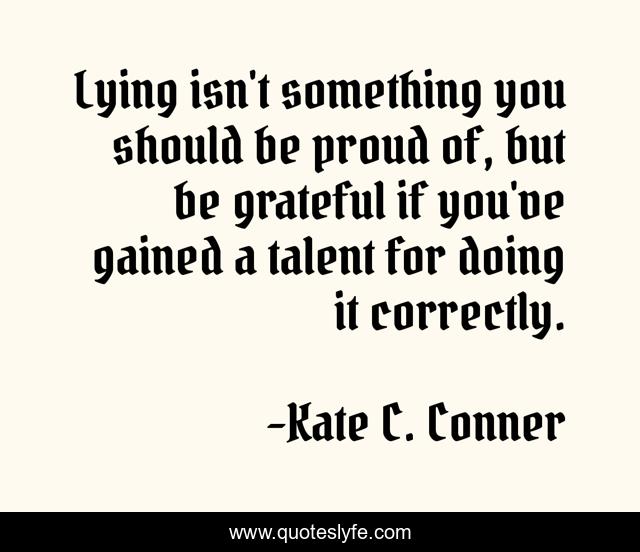 This page presents the quote "Lying isn't something you should be proud of, but be grateful if you've gained a talent for doing it correctly.". Author of this quote is Kate C. Conner. This quote is about lies, proud, grateful, lying,.