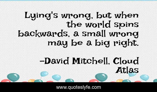 This page presents the quote "Lying's wrong, but when the world spins backwards, a small wrong may be a big right.". Author of this quote is David Mitchell, Cloud Atlas. This quote is about lie, wrong, right,.