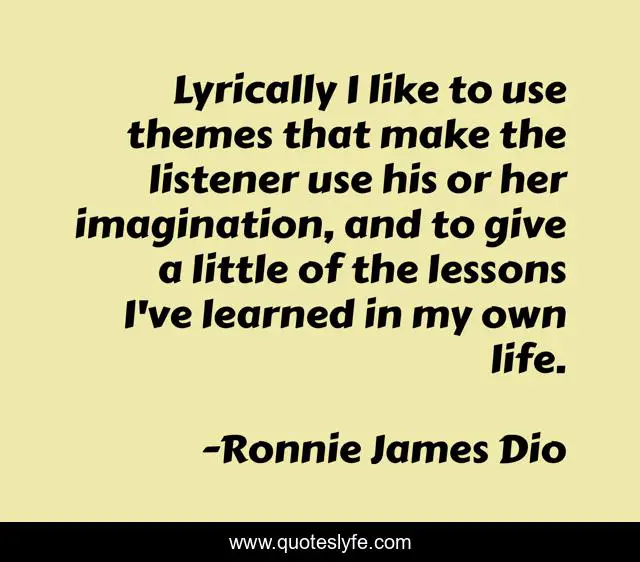 This page presents the quote "Lyrically I like to use themes that make the listener use his or her imagination, and to give a little of the lessons I've learned in my own life.". Author of this quote is Ronnie James Dio. This quote is about life, little, her,.
