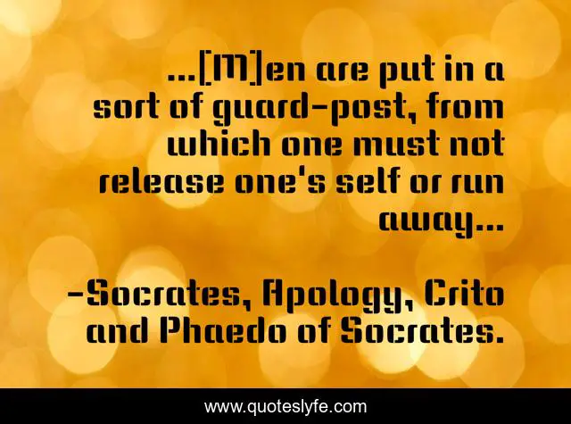 This page presents the quote "...[M]en are put in a sort of guard-post, from which one must not release one's self or run away...". Author of this quote is Socrates, Apology, Crito and Phaedo of Socrates.. This quote is about suicide, honor,.