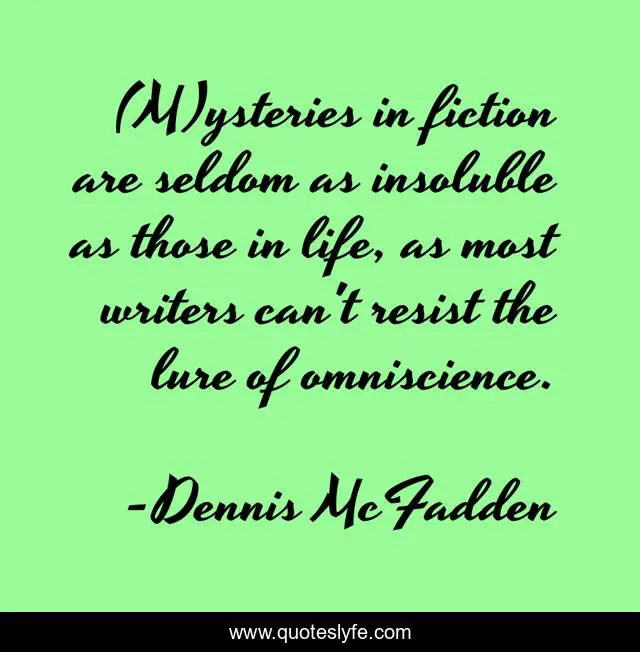This page presents the quote "(M)ysteries in fiction are seldom as insoluble as those in life, as most writers can't resist the lure of omniscience.". Author of this quote is Dennis McFadden. This quote is about mystery, fiction,.