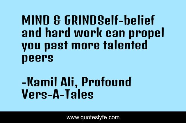 This page presents the quote "MIND & GRINDSelf-belief and hard work can propel you past more talented peers". Author of this quote is Kamil Ali, Profound Vers-A-Tales. This quote is about kamiltheauthor, talent, belief, profound, philosophy, mind, grind,.