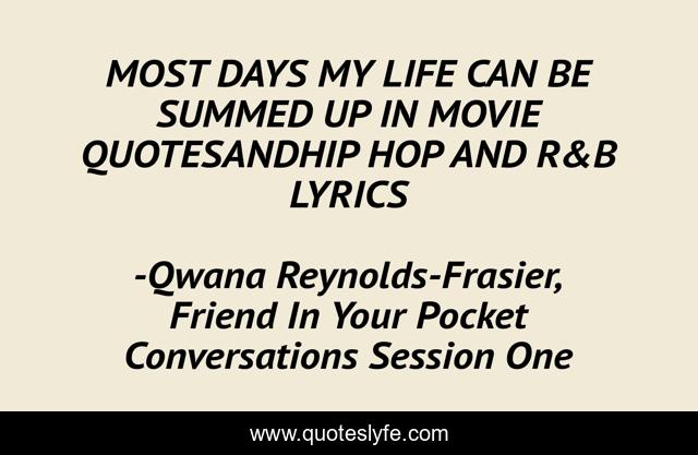 This page presents the quote "MOST DAYS MY LIFE CAN BE SUMMED UP IN MOVIE QUOTESANDHIP HOP AND R&B LYRICS". Author of this quote is Qwana Reynolds-Frasier, Friend In Your Pocket Conversations Session One. This quote is about love, hopenation, qwana-reynolds, poetry, cardi-b, movies, black-girl-magic, music, hip-hop,.