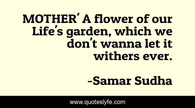 This page presents the quote "MOTHER' A flower of our Life's garden, which we don't wanna let it withers ever.". Author of this quote is Samar Sudha. .