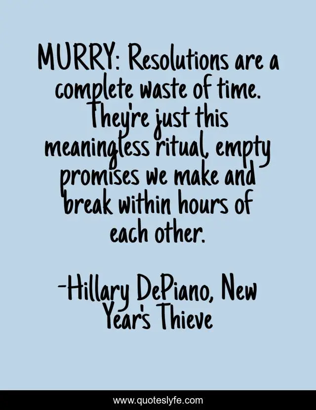 This page presents the quote "MURRY: Resolutions are a complete waste of time. They're just this meaningless ritual, empty promises we make and break within hours of each other.". Author of this quote is Hillary DePiano, New Year's Thieve. This quote is about new-year, new-years, traditions, new-year-s, promises, new-year-s-eve, new-year-s-resolutions, goals, new-years-eve,.