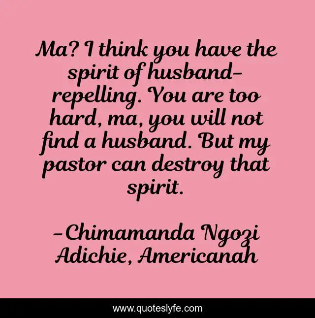 This page presents the quote "Ma? I think you have the spirit of husband-repelling. You are too hard, ma, you will not find a husband. But my pastor can destroy that spirit.". Author of this quote is Chimamanda Ngozi Adichie, Americanah. This quote is about africa, spirit,.