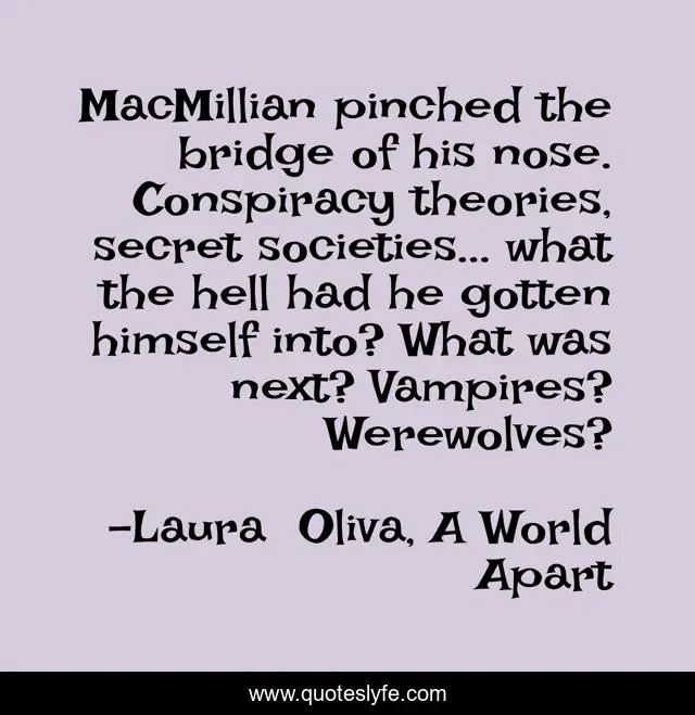 This page presents the quote "MacMillian pinched the bridge of his nose. Conspiracy theories, secret societies... what the hell had he gotten himself into? What was next? Vampires? Werewolves?". Author of this quote is Laura Oliva, A World Apart. This quote is about secret-societies, conspiracy-theories, vampires, werewolves,.