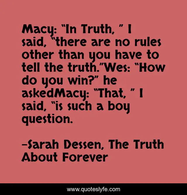 This page presents the quote "Macy: “In Truth, ” I said, “there are no rules other than you have to tell the truth.”Wes: “How do you win?” he askedMacy: “That, ” I said, “is such a boy question.". Author of this quote is Sarah Dessen, The Truth About Forever. This quote is about wes, forever, macy, truth,.