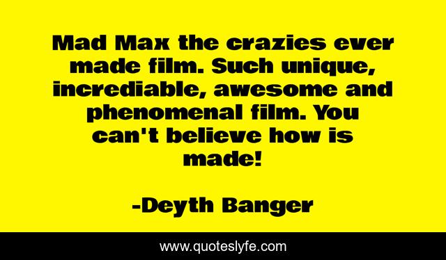 This page presents the quote "Mad Max the crazies ever made film. Such unique, incrediable, awesome and phenomenal film. You can't believe how is made!". Author of this quote is Deyth Banger. This quote is about awesome, made, crazies, incrediable, film,.