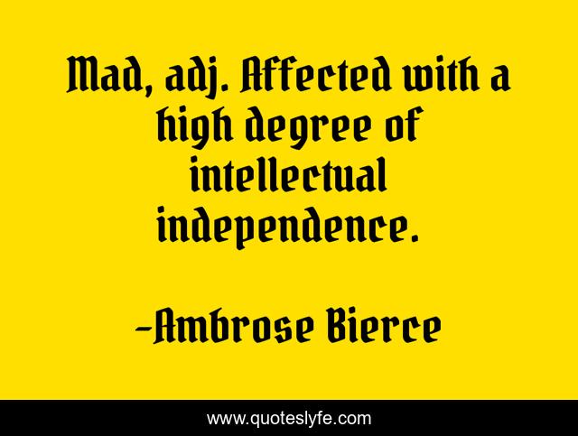 This page presents the quote "Mad, adj. Affected with a high degree of intellectual independence.". Author of this quote is Ambrose Bierce. This quote is about independence, intellectual,.