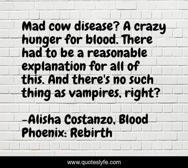 This page presents the quote "Mad cow disease? A crazy hunger for blood. There had to be a reasonable explanation for all of this. And there's no such thing as vampires, right?". Author of this quote is Alisha Costanzo, Blood Phoenix: Rebirth. This quote is about humor, vampires,.