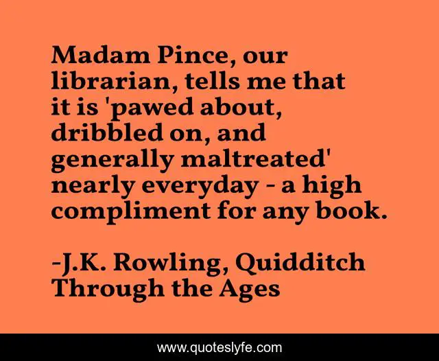 This page presents the quote "Madam Pince, our librarian, tells me that it is 'pawed about, dribbled on, and generally maltreated' nearly everyday - a high compliment for any book.". Author of this quote is J.K. Rowling, Quidditch Through the Ages. This quote is about books, quidditch, reading,.