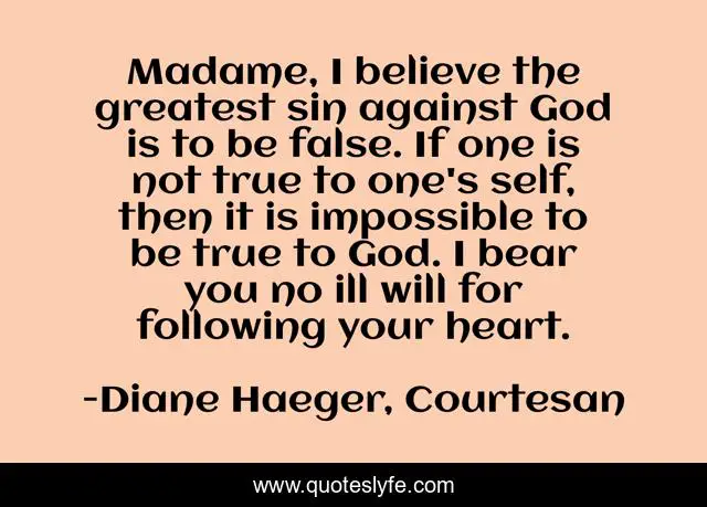 This page presents the quote "Madame, I believe the greatest sin against God is to be false. If one is not true to one's self, then it is impossible to be true to God. I bear you no ill will for following your heart.". Author of this quote is Diane Haeger, Courtesan. .