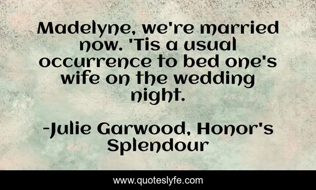 This page presents the quote "Madelyne, we're married now. 'Tis a usual occurrence to bed one's wife on the wedding night.". Author of this quote is Julie Garwood, Honor's Splendour. This quote is about romance, humor, julie-garwood, honor-s-splendour,.