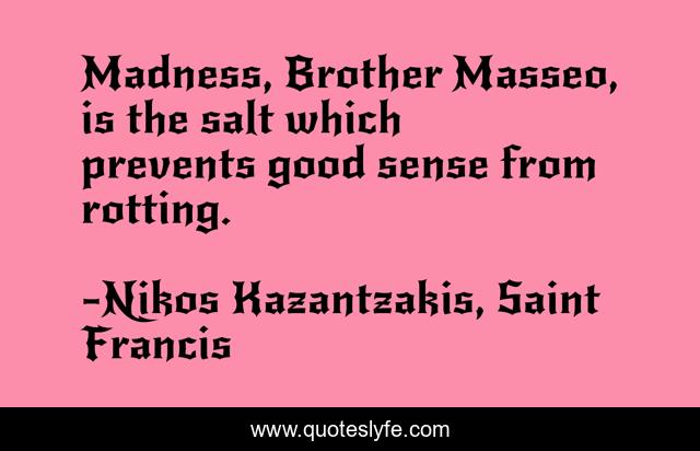 This page presents the quote "Madness, Brother Masseo, is the salt which prevents good sense from rotting.". Author of this quote is Nikos Kazantzakis, Saint Francis. This quote is about francis-of-assisi, madness, 1962,.