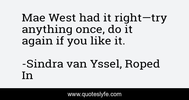 This page presents the quote "Mae West had it right—try anything once, do it again if you like it.". Author of this quote is Sindra van Yssel, Roped In. This quote is about erotica, roped-in, sindra-van-yssel,.