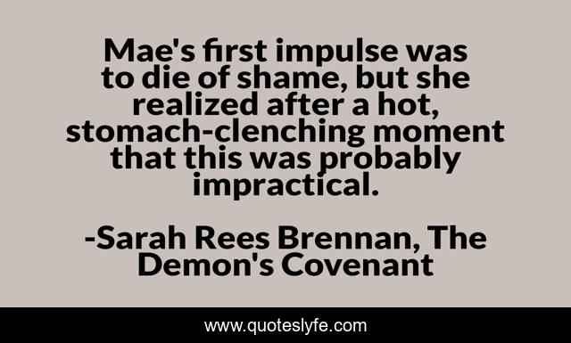 This page presents the quote "Mae's first impulse was to die of shame, but she realized after a hot, stomach-clenching moment that this was probably impractical.". Author of this quote is Sarah Rees Brennan, The Demon's Covenant. This quote is about mae-crawford, humor, embarrassment, sarah-rees-brennan, shame, mae, the-demon-s-covenant,.