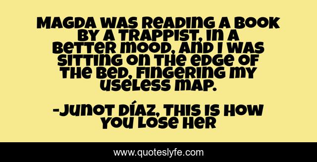 This page presents the quote "Magda was reading a book by a Trappist, in a better mood, and I was sitting on the edge of the bed, fingering my useless map.". Author of this quote is Junot Díaz, This Is How You Lose Her. This quote is about wit, humor,.