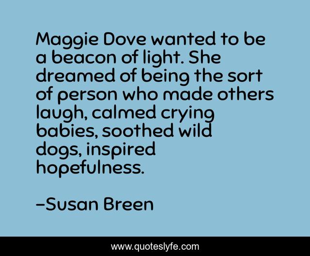 This page presents the quote "Maggie Dove wanted to be a beacon of light. She dreamed of being the sort of person who made others laugh, calmed crying babies, soothed wild dogs, inspired hopefulness.". Author of this quote is Susan Breen. This quote is about mystery, enthusiasm, inspirational,.