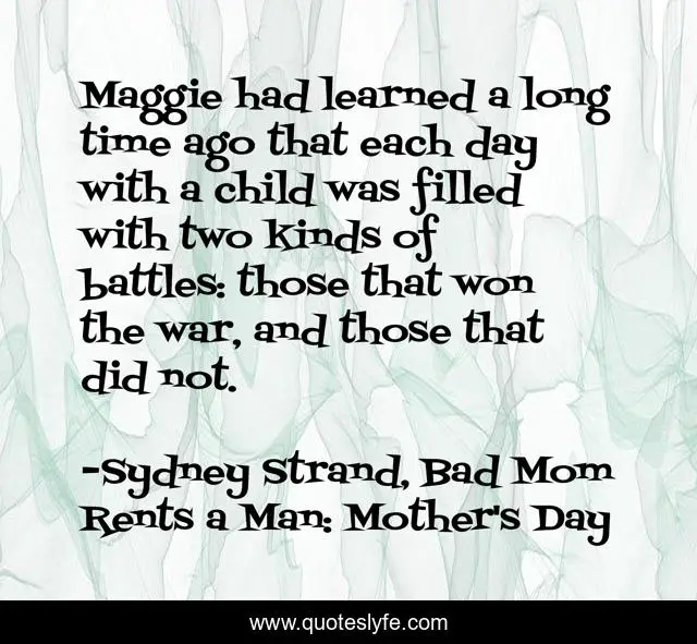 This page presents the quote "Maggie had learned a long time ago that each day with a child was filled with two kinds of battles: those that won the war, and those that did not.". Author of this quote is Sydney Strand, Bad Mom Rents a Man: Mother's Day. This quote is about mothers-and-daughers, motherhood, humor, parenting,.