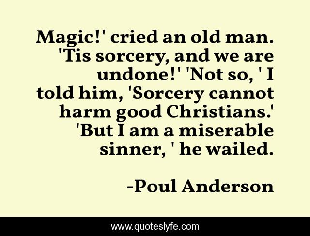 This page presents the quote "Magic!' cried an old man. 'Tis sorcery, and we are undone!' 'Not so, ' I told him, 'Sorcery cannot harm good Christians.' 'But I am a miserable sinner, ' he wailed.". Author of this quote is Poul Anderson. This quote is about religion, sin,.