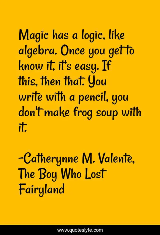 This page presents the quote "Magic has a logic, like algebra. Once you get to know it, it's easy. If this, then that. You write with a pencil, you don't make frog soup with it.". Author of this quote is Catherynne M. Valente, The Boy Who Lost Fairyland. .