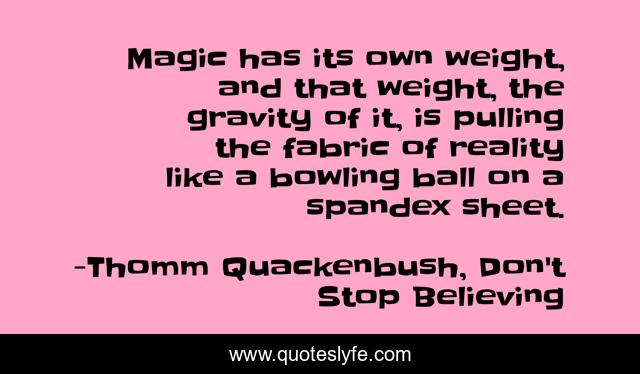 This page presents the quote "Magic has its own weight, and that weight, the gravity of it, is pulling the fabric of reality like a bowling ball on a spandex sheet.". Author of this quote is Thomm Quackenbush, Don't Stop Believing. This quote is about magic, reality,.