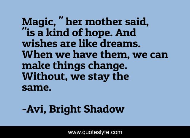 This page presents the quote "Magic, " her mother said, "is a kind of hope. And wishes are like dreams. When we have them, we can make things change. Without, we stay the same.". Author of this quote is Avi, Bright Shadow. This quote is about enthusiasm, inspirational, insightful,.